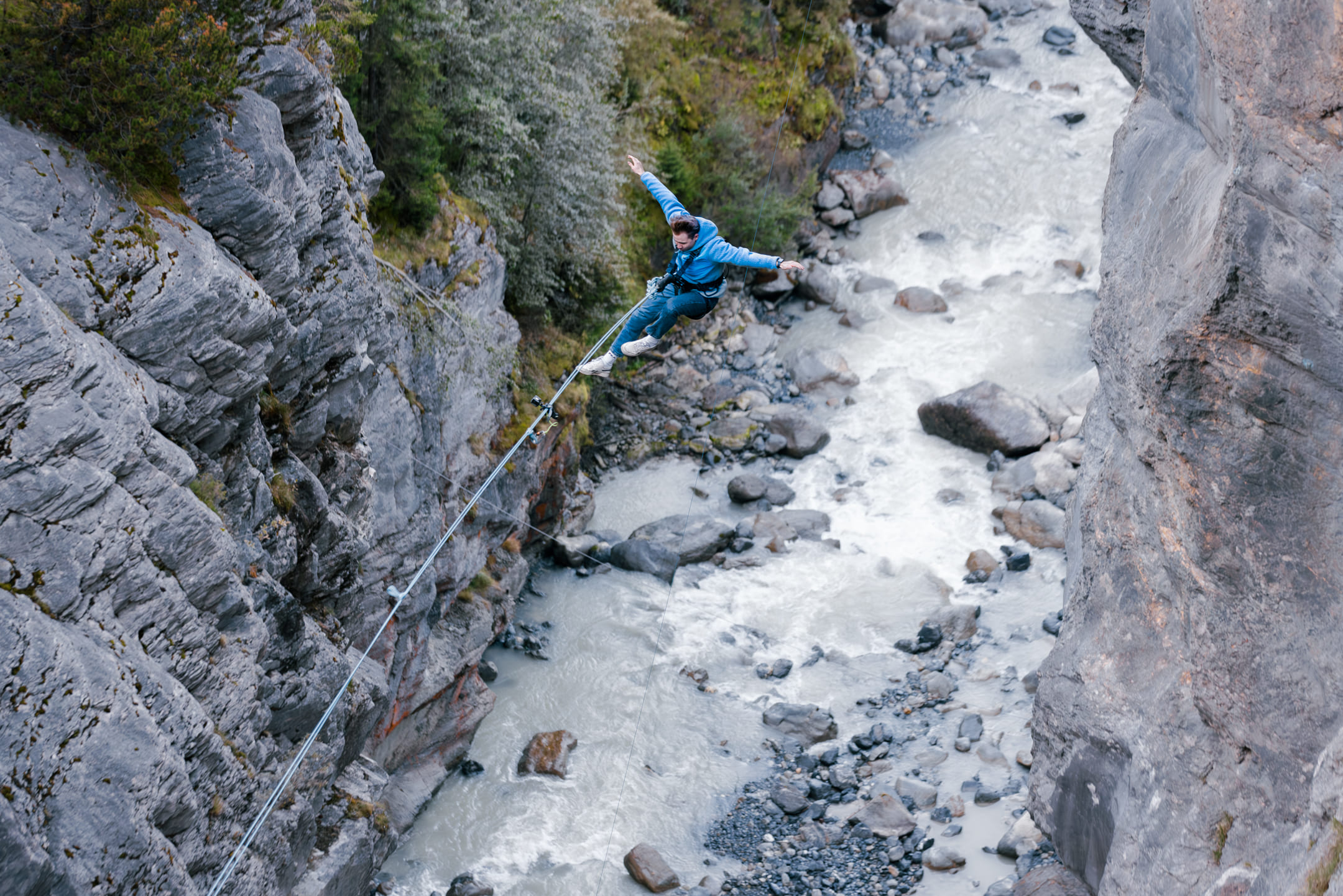 انزل من المنصة التي يبلغ ارتفاعها 90 مترًا، وواجه لحظة عابرة من انعدام الوزن قبل النزول إلى السقوط الحر المبهج فوق المياه البيضاء المتدفقة لنهر لوتشين. انقض بين جدران المضيق الضيق بسرعة 120 كم/ساعة، ثم أبطئ من سرعتك، وانظر إلى الأعلى، وفكر في نفسك: “أريد أن أفعل ذلك مرة أخرى”. تُعدّ مغامرة “كانيون سوينغ” في غريندلوالد مغامرة جريئة ومثيرة في جبال الألب السويسرية. على استعداد للقفزة؟