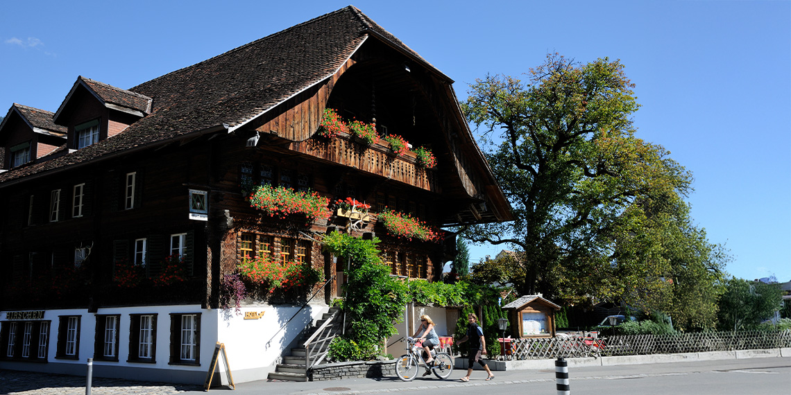 Fahren Sie durch die charmanten Straßen der Altstadt von Unterseen mit ihrer traditionellen Schweizer Architektur.