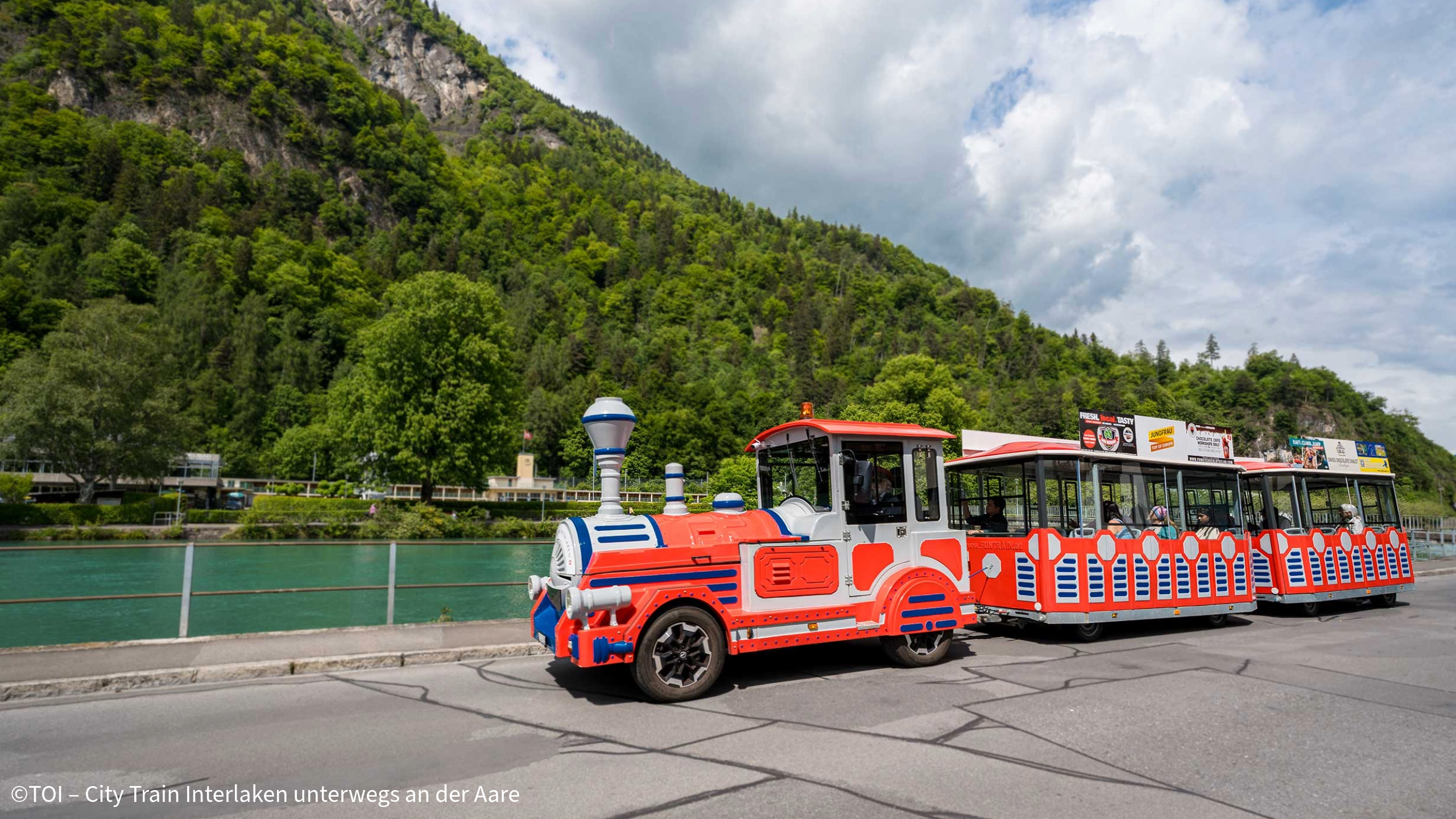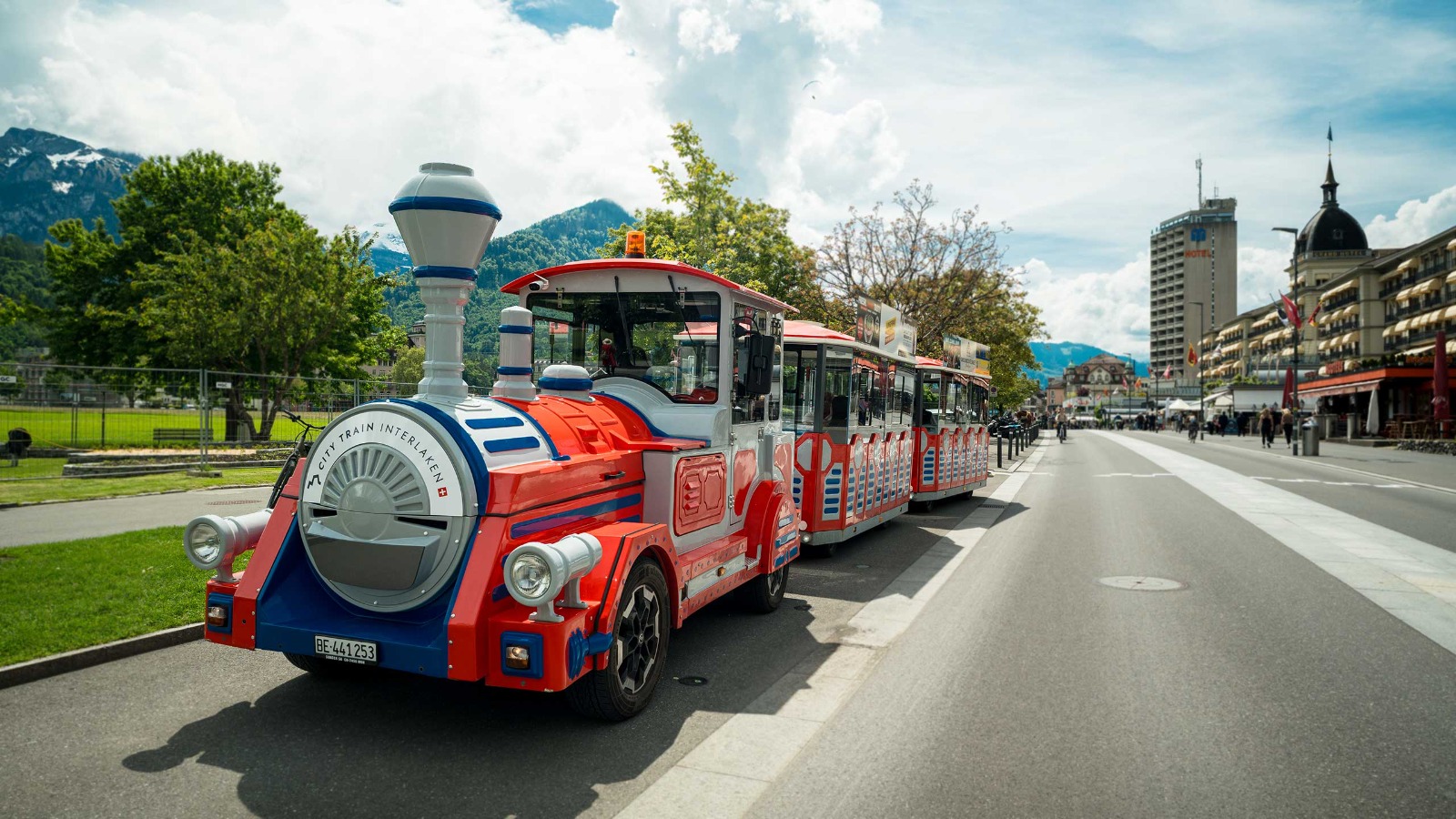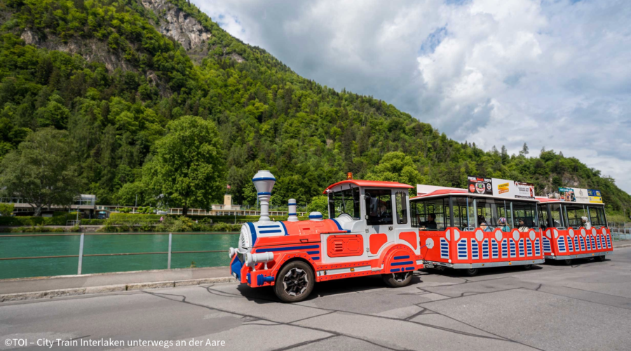 Treffen Sie sich an der Höhematte und beginnen Sie Ihre entspannte Fahrt mit dem City Train durch das Herz von Interlaken.